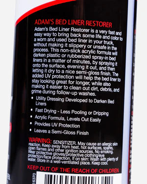 Adam’s Bed Liner Restorer is a very fast and easy way to revitalize the appearance of a worn out and heavily used truck bed liner, without making it slippery or unsafe in the process. This formula is an acrylic-based, sprayable coating that will darken plastics and rubberized spray-in bed liners in a matter of minutes and make them look factory new again. Adam’s Bed Liner Restorer is ready to use and can be applied by spraying it directly onto the surface, letting it penetrate and soak in, and then evening out the appearance, where necessary, while it dries to a satin sheen or semi-gloss finish.