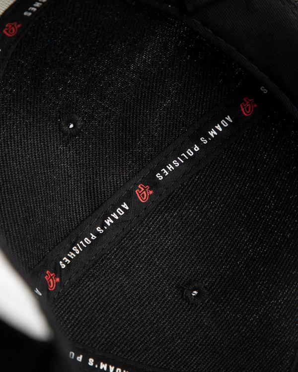 المظهر ذو اللونين الأسود والرمادي بسيط ونظيف وله رقعة من الجلد الصناعي الأسود الأنيق على قبعة مخصصة تحمل علامة Adam's Polishes.